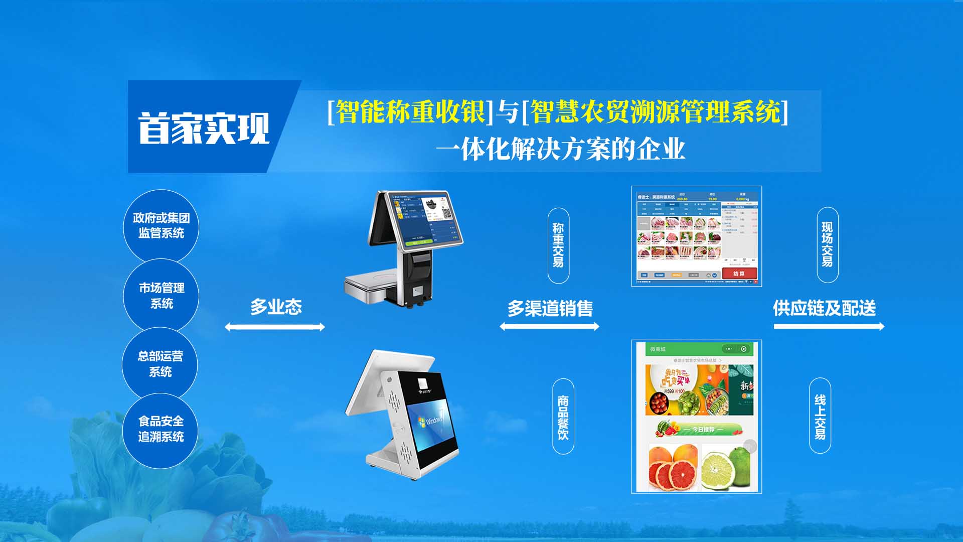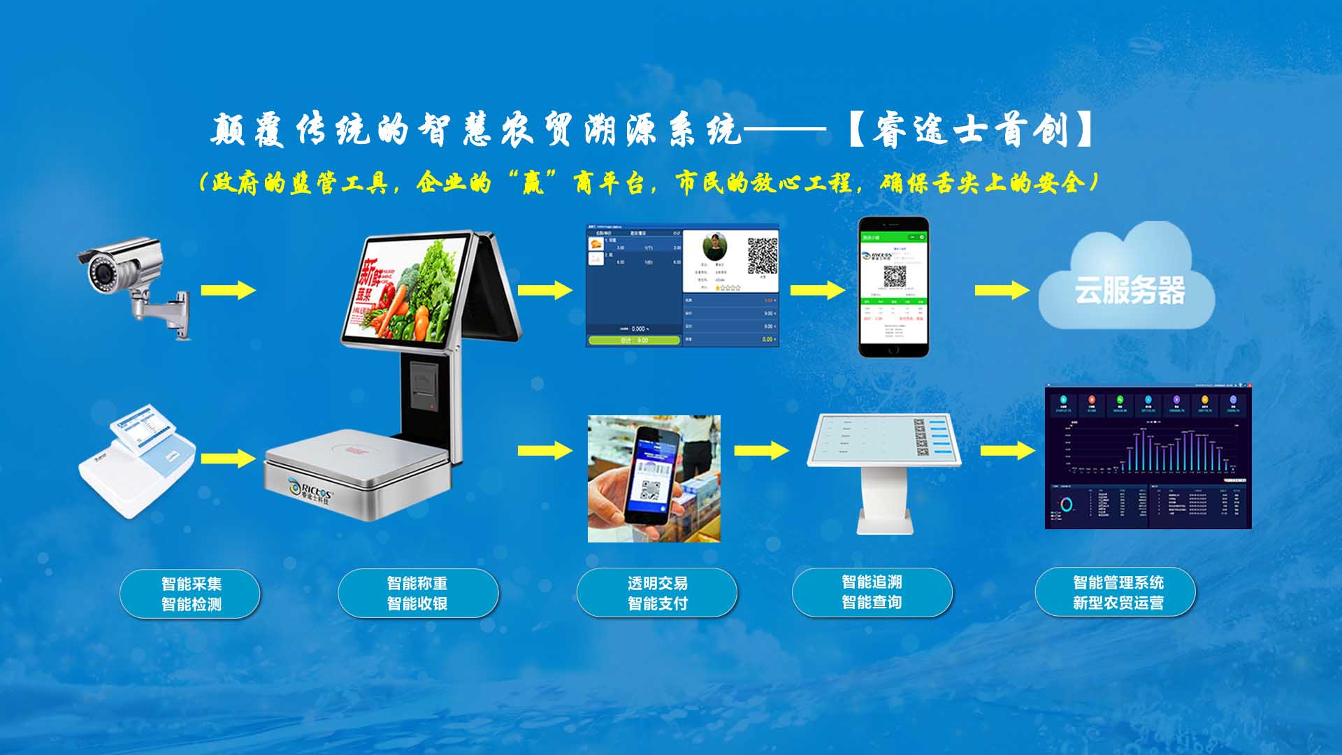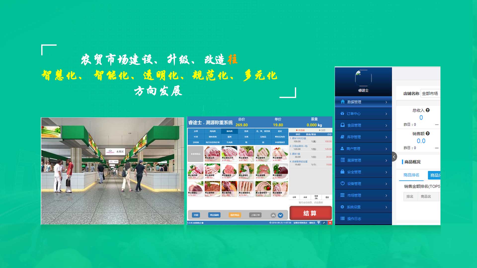 創(chuàng)新實現(xiàn)了【智慧農貿溯源管理系統(tǒng)】與【智能稱重收銀】一體化解決方案,集市場管理、運營管理、溯源追溯、智能收銀大數(shù)據(jù)運用于一體,硬件、軟件與管理系統(tǒng)完美結合。適用于農批、農貿市場蔬菜、生鮮、水果、水產、肉類、熟食等稱重和非稱重銷售;由于采用一體化設計,解決了傳統(tǒng)農貿市場無法實現(xiàn)的信息化、智能化、可追溯的管理問題;使稱重、收銀、追溯、管理、更透明、公正、安全,讓顧客無后顧之憂,給管理工作帶來極大的便捷與高效,對國內農產品行業(yè)的發(fā)展、農產品流通管理起到了典范作用。 【睿途士首創(chuàng)】顛覆傳統(tǒng)的“智慧農貿市場系統(tǒng)”,解決了傳統(tǒng)農貿系統(tǒng)單一安卓掛屏,昂視不方便看、不直觀、無互動性,傳輸信息不齊全、不穩(wěn)定的問題,也解決了按鍵電子秤商品難找、商品代碼難記、按鍵操作不靈活、支付不智能,對收銀管理、銷售商品、菜名、菜價、打折、優(yōu)惠、會員、線上下單、采購等無法實現(xiàn)實際菜品交易和追溯等問題。 更具顛覆性的是睿途士智慧系統(tǒng)擁有三大管理平臺(市場管理平臺、總部運營管理平臺、商戶后臺管理平臺)、一個可視操作前臺和三大追溯功能,讓遠程管理、數(shù)據(jù)傳輸、人機互動、智能控制、移動支付、大數(shù)據(jù)、互聯(lián)通信、云端存儲、人工智能、智能城市、電子定位、智能收銀等功能得以實現(xiàn)。